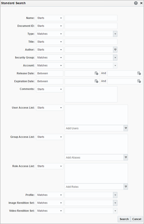 You can provide detailed search criteria using search forms in either user interface. Search forms allow you to enter criteria in most available metadata fields or use special query syntax to create powerful ways of searching. The standard search form can often include many metadata fields that you may not use, and so a system administrator may have set up profile forms to display metadata fields that are useful for finding certain types of documents. For example, one profile may be set to display fields useful to finding legal contracts, while another profile may be set to display fields useful to finding account invoices. For details on profiles, see Content Profiles.