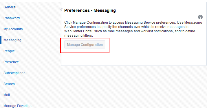 The Messaging page in Preferences provides a Manage Configuration button for navigating to User Messaging Preferences.