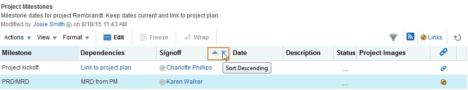 When a list is too wide to display all of its columns in one view, you can scroll the list left and right. If there is a column you always want to keep in view, you can use column freezing to hold a column in place during scrolling. Freezing causes a selected column to hold its position while the columns to the right of it scroll by. You can set Freeze on one column on a given list instance. Freezing holds in place the selected column and any column to the left of it.