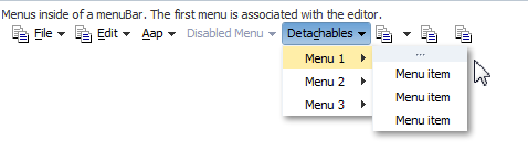Menus and submenus can be made to be detachable and to float on the browser window. Figure 15-10 shows the Menu 1 submenu in the Detachables menu configured to be detachable. The top of the menu is rendered with a bar to indicate that it can be detached.