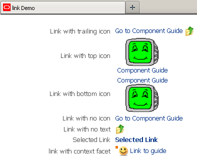 The button and link components can render images, along with optional text, as shown in Figure 20-7 and Figure 20-8. You can determine the position of the image relative to the optional text by setting a value for the iconPosition attribute. In addition, you can set different icons for when the user hovers over an icon, or the icon is depressed or disabled. You specify the image to use by setting a value for the icon attribute. The button and link components expand to the number of pixels required to accommodate the image that you specify to render within the component. If you do not specify an image, the component renders using the minimum dimensions specified for the component in the web application's skin.