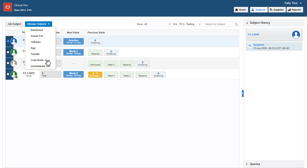 代码断开可解除对象的治疗臂的隐蔽。根据研究协议,Oracle Clinical One Platform 可能会自动撤回您使用代码断开隐蔽的主题,并且您可能需要完成撤回访问