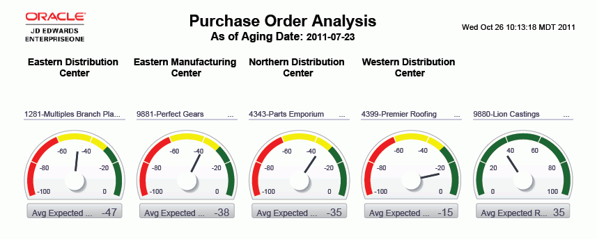 「採購單驗收分析」報表可讓您完整掌握量表、圖形、圖表與表格上顯示的資訊。在量表中選取其中一個供應商以顯示與該特定供應商的相關資訊。此報表的目的是將一些來自其他報表的關鍵評量包含在數量分析及商品之已驗收但未開立傳票的累計視圖中。「採購單驗收分析」報表包含下列報表元件: