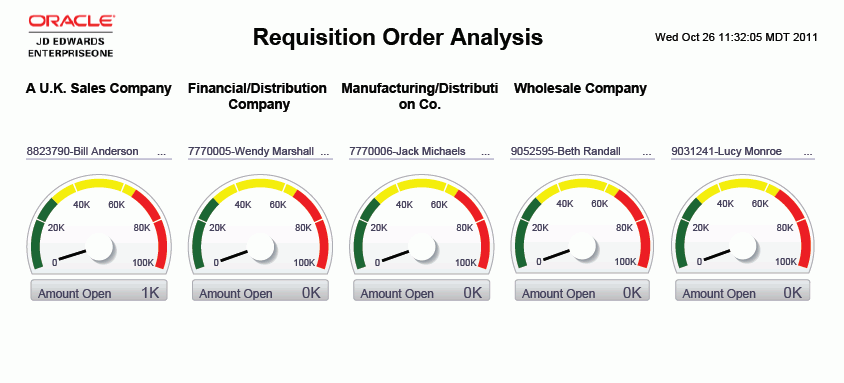 「請購自助服務分析」報表可讓您完整掌握量表、圖形、圖表與表格上顯示的資訊。此報表將一些來自其他報表的關鍵評量包含在委派請購單的累計視圖中。委派的請購單可以在要求者、供應商、UNSPSC 代碼及料品層級上進行分析。此報表包含下列報表元件: